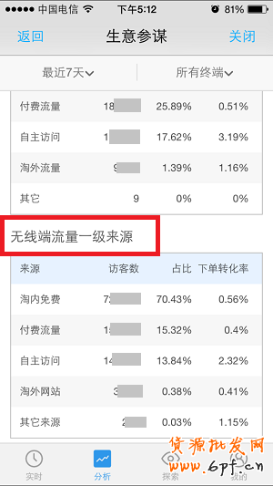2、來源分類:淘內(nèi)免費、付費流量、自主訪問、淘外流量、其他,PC端和無線端的來源分類是可以單獨查看的。