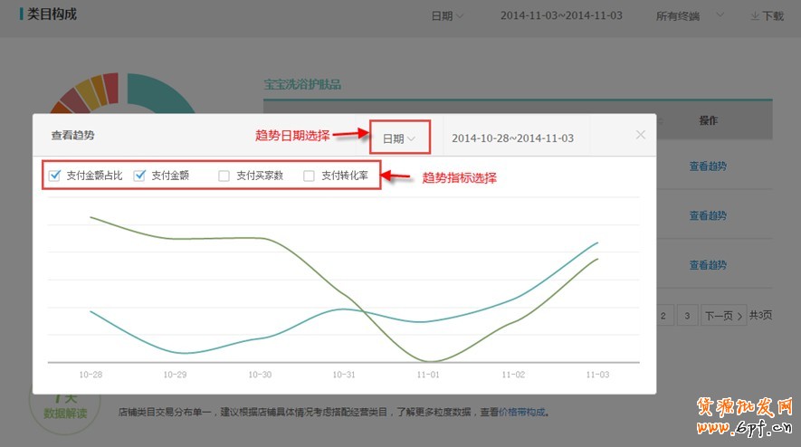 關(guān)于選擇指標(biāo),最多只能選擇4項(xiàng)(終端維度數(shù)*選擇的指標(biāo)數(shù)),比如所有終端、PC端就是2個終端維度,支付金額、支付買家數(shù)就是2個選擇的指標(biāo),所以2*2=4,已選擇了4項(xiàng)。