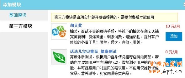 第三方模塊:店鋪裝修之外的其他應用,比如與店鋪緊密結合的商品展示、商品導購、關聯推薦、營銷、SNS、個性定制等行業(yè)化需求,都可以通過這些模塊,輕松幫助賣家在店鋪前臺實現。