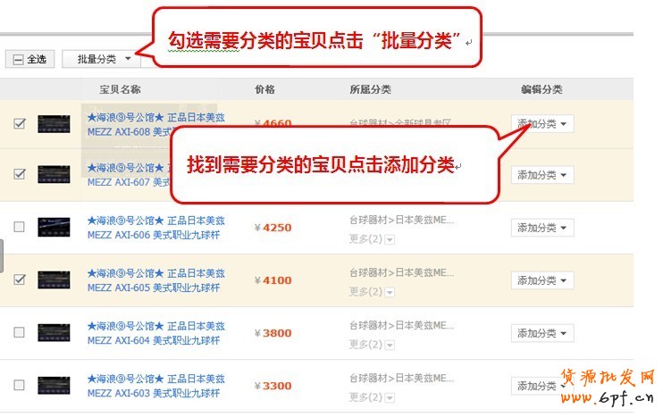 2.可以對單個未分類寶貝添加分類,也可以操作”批量分類“: