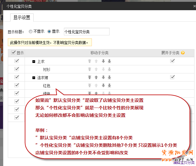 個性化寶貝分類是讀取了剛才后臺設置的分類之后,修改編輯和刪減都不會影響后臺寶貝分類的主設置