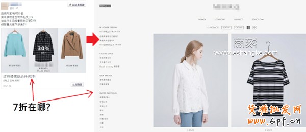 消費(fèi)者進(jìn)入到你的頁(yè)面前的思考脈絡(luò)非常重要,例如下面的廣告范例,消費(fèi)者看到服飾7折的廣告,但點(diǎn)擊后進(jìn)入的頁(yè)面(Landing Page)居然看不到任何明顯有關(guān)7折的文字。
