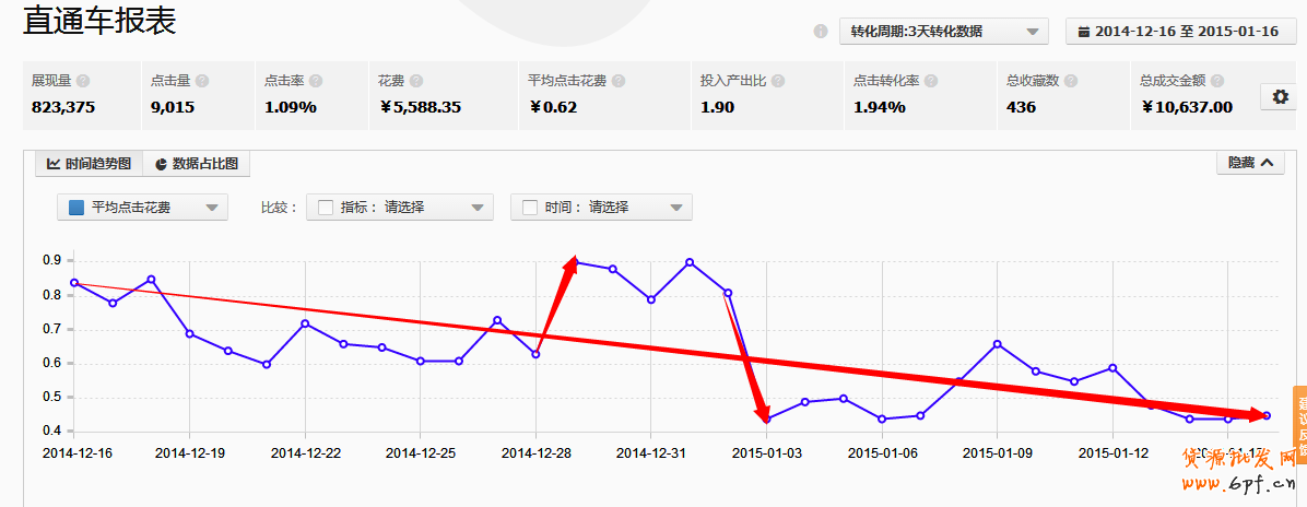 可以看出寶貝在春節(jié)的時(shí)候PPC是在不斷下降的,因?yàn)榇汗?jié)期間PPC下降的效果是比以往下降了一半。