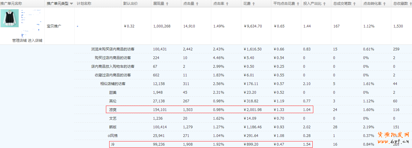 由于店鋪內(nèi)推廣的寶貝較多,在選取天氣標簽寶貝測試的時候,我們選擇流量較大,基礎數(shù)據(jù)較好的寶貝進行測試,故選擇了賬戶中的主推款寶貝進行測試,這樣一方面可以有較多的花費金額支持,另一方面也會有較多的流量支持。