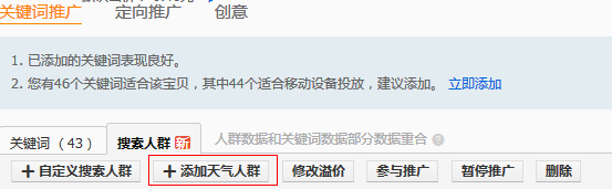 2、然后進(jìn)入直通車后臺(tái),對(duì)應(yīng)的寶貝關(guān)鍵詞頁(yè)面,選擇搜索人群推廣,添加天氣人群。