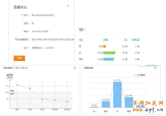 自定義人群流量會很大,特別對于點擊率比較高的寶貝投放比例要謹慎,前期可以以5%-10%的比例進行投放,重點是對維度的選擇。受眾維度包括了用戶性別、年齡、買家消費額度。這里可以通過淘寶指數(shù)結(jié)合生意參謀中的訪客分析來進行篩選。