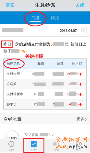 3、流量來源:淘內(nèi)免費(fèi)、付費(fèi)流量、自主訪問、淘外流量、其他,PC端和無線端的來源分類是可以單獨(dú)查看。