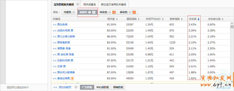 由于我們要的是流量,選詞的話(huà)一般就按兩個(gè)指標(biāo)來(lái)篩選,一個(gè)是展現(xiàn)量,另一個(gè)是點(diǎn)擊率,所以“流量包”是我們的首選,可以對(duì)流量包的關(guān)鍵詞的點(diǎn)擊率進(jìn)行排序,選擇合適的精準(zhǔn)詞進(jìn)行推廣。