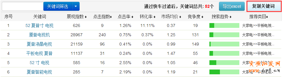 通過產(chǎn)品知識、標題、詳情頁等,我們可以看到,產(chǎn)品名稱為“電視“,品牌為”夏普“,型號為”52NX550A“,尺寸為”52英寸“,分辨率為”1080“,無”3D”,聯(lián)網(wǎng)方式為”無線鏈接“,無”操作系統(tǒng)“等等,我們可以將“電視”“夏普”“52英寸”等關(guān)鍵詞進行整理,放進快車網(wǎng)選詞工具里,如果下圖所示。
