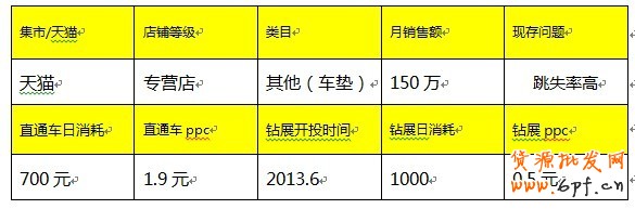 1、店鋪是以車墊為主賣的天貓專營店,月銷售額150萬左右,客單價420,付費推廣主要依靠鉆展和直通車。