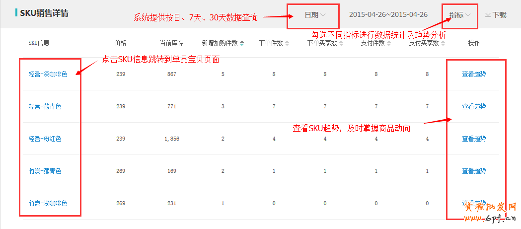 SKU銷售詳情查詢,提供了SKU信息(顏色、功能)、價(jià)格、當(dāng)前庫存、新增加購件數(shù)、下單件數(shù)、下單買家數(shù)、支付件數(shù)、支付買家數(shù)的數(shù)據(jù)統(tǒng)計(jì)展示。同時(shí),也提供SKU的銷售趨勢(shì)分析。
