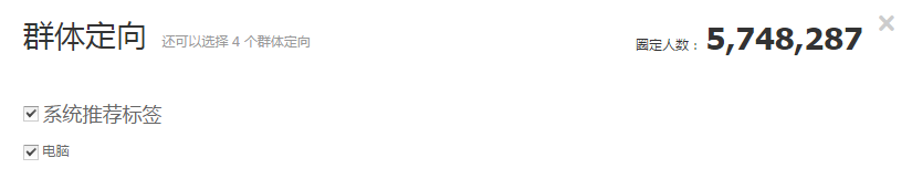 群體定向通過(guò)系統(tǒng)推薦設(shè)置圈定的人群有574萬(wàn),而興趣點(diǎn)定向圈定的人群只有175萬(wàn)