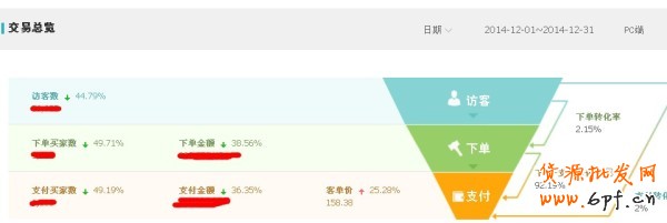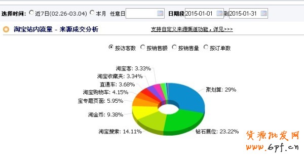 從上圖,我們可以大致的看出整體店鋪的流量結構。從12月份的流量結構來看,店鋪的免費流量并不是很高,尤其是自然搜索流量更低,并且免費流量大部分來源于淘寶專題頁面,聚劃算的流量占比也是相當高,可以說,整體的流量結構并不是很健康。