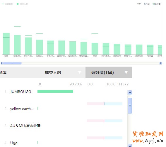 通過(guò)全景洞察偏好分析,我們發(fā)現(xiàn),女鞋類(lèi)目與女包、女裝相關(guān)度不高。因此我們拉新和關(guān)聯(lián)的主要店鋪是女鞋店鋪。通過(guò)品牌偏好的排序,我們選擇了yellowearth、AUMU、UGG等品牌。
