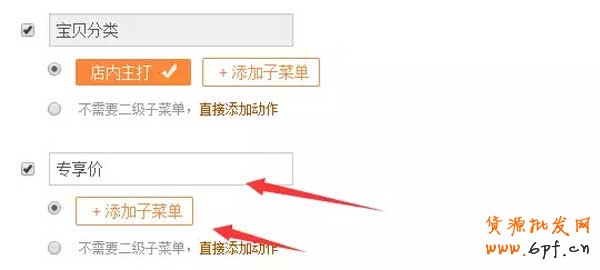 5.下面設(shè)置微淘專享的菜單,輸入要展現(xiàn)出來的名稱,點開添加子菜單