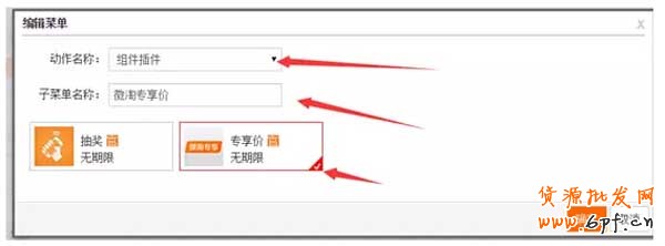 選擇動作名稱為:組件插件,并取好子菜單名字,勾選微淘專享價的插件。因為之前設(shè)置了專享價活動,所以直接勾選這個插件就可以啦