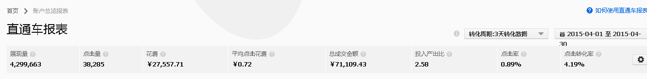 數(shù)據分析:從以上數(shù)據可以看出,4月份賬戶的ROI為2.58,PPC為0.72元。直通車效果呈現(xiàn)比較穩(wěn)定的狀態(tài)。