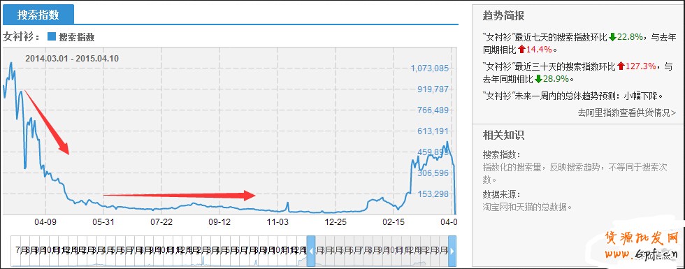 通過淘寶指數(shù)的數(shù)據(jù)反饋,我們可以看出,在3~6月份這段時(shí)間內(nèi),襯衫寶貝是呈現(xiàn)下滑趨勢(shì)的,但是我們也不能因?yàn)榭吹竭@樣的數(shù)據(jù)就覺得不需要再做襯衫的推廣了,畢竟市場(chǎng)還是有需求的,現(xiàn)在到5月份還是可以進(jìn)行推廣的,到了5月底的時(shí)候,就可以做好寶貝的清倉、低價(jià)引流培養(yǎng)了。