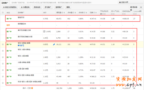 2) 勤優(yōu)化,前期最好是高出價,提高寶貝的曝光率,可以引入精準(zhǔn)流量,這樣優(yōu)化會比較輕松。一般預(yù)算充足的話可以加價幅度大一些,盡快獲取到流量;有些定向一開始出價太低,到后期再怎么提高出價流量也沒幾個;根據(jù)7天點(diǎn)擊率和收藏來評判是否提價,14天展現(xiàn)大,點(diǎn)擊率低的,可以優(yōu)化圖片再測試一周時間,如果還是沒效果那說明這個標(biāo)簽和你寶貝相關(guān)低,可以暫?;騽h除;