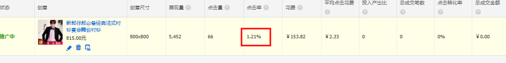 2、關鍵詞:禮服男裝,不像普通男裝,相較于大眾款式來說,搜索量不是很大,所以賬戶前期流量是比較少的,且點擊率比較低。從賬戶直通車報表可以看出賬戶前期的流量比較少,點擊率和一般性的男裝的點擊率相比比較低。所以我們在賬戶優(yōu)化添加關鍵詞的時候選擇一少數關鍵詞優(yōu)化,精準為主,主要是禮服類的關鍵詞,前期控制展現,穩(wěn)定點擊率。