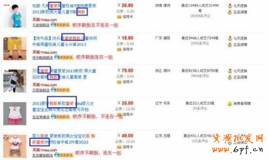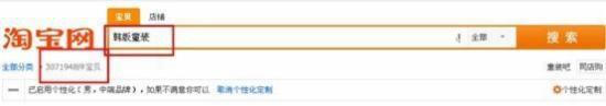 這類關(guān)鍵詞,淘寶會(huì)認(rèn)為是一個(gè)詞組。如果中間有空格的話,淘寶會(huì)直接認(rèn)定為是詞組(比如上面談到的“三 輪車”的例子);如果沒有空格,淘寶會(huì)自己進(jìn)行分詞。搜索出來的結(jié)果,分開的兩個(gè)(或者幾個(gè))詞可能連在一起,也可能不連在一起,也可能前后順序不一樣。比如我們搜索“韓版童裝”和“韓版 童裝”: