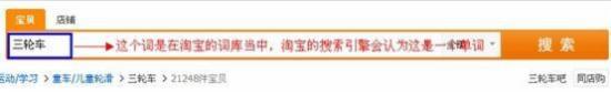 對于這種形式的關(guān)鍵詞,淘寶會(huì)認(rèn)為他是一個(gè)詞,在展示搜索結(jié)果時(shí),這個(gè)詞不管幾個(gè)字,必須完全連在一起并出現(xiàn)在標(biāo)題中的寶貝才有被展示的機(jī)會(huì)。不連在一起的不能被提取出來,比如我們在淘寶的搜索框里面搜索“三輪車”這個(gè)關(guān)鍵詞: