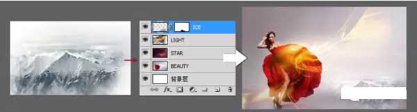四、繼續(xù)導(dǎo)入冰(ice)素材,拖到光素材上方,混合模式為疊加,然后添加圖層蒙版,最后進(jìn)行調(diào)整,如下圖的效果圖。