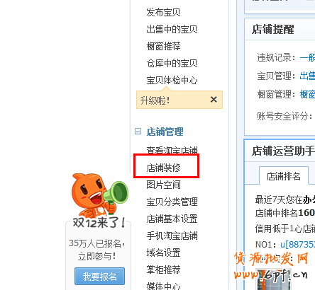 1.登錄淘寶,創(chuàng)建淘寶店鋪,點擊進入賣家中心后臺,在頁面的左側(cè)的菜單上選擇“店鋪裝修”接著進入網(wǎng)店裝修頁面。(如下圖)