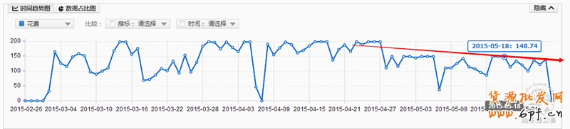 2月28號—4月5號為單品模式推廣階段,此階段挑選了5款有一定銷量基礎(chǔ)的寶貝進(jìn)行培養(yǎng),每天的推廣預(yù)算為200元。從趨勢圖可以看出,推廣后流量逐步上升,但此階段沒有轉(zhuǎn)化,每天引進(jìn)的流量只帶來了少量的收藏。沒有轉(zhuǎn)化的原因可能有兩點,一是寶貝的款式不受消費(fèi)者青睞,二是寶貝引進(jìn)的流量還不夠多,沒法促成轉(zhuǎn)化。因此,在接下來的調(diào)整中,小編想要重新挑選寶貝進(jìn)行培養(yǎng)測試,且在預(yù)算內(nèi),繼續(xù)降低PPC,低價引進(jìn)更多的流量,促成成交的機(jī)會。由于店鋪的其他寶貝都是沒有銷量基礎(chǔ)的,且店鋪的自然流量少,店鋪銷售數(shù)據(jù)報表沒有參考性。寶貝的市場屬性購買偏好,統(tǒng)計數(shù)據(jù)少。索性就讓消費(fèi)者去挑選自己喜歡的產(chǎn)品進(jìn)行點擊。把單品模式改成全店的推廣模式,(4月5日—5月25日的報表時間段為全店推廣模式的報表數(shù)據(jù)。)