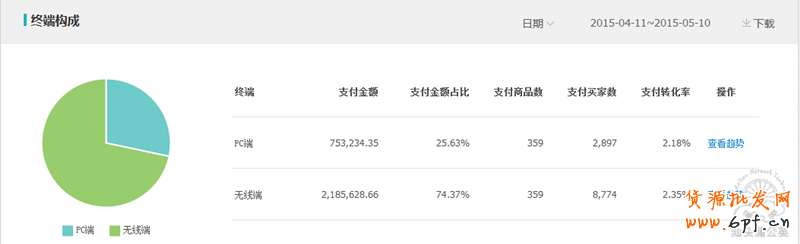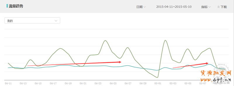 從店鋪的流量趨勢可以看出,近一個月的流量是呈上升趨勢的,PC端和無線端在流量上都有同樣的增長,而在換季過渡時期,流量則呈波動狀態(tài),但隨著各種流量的引入,總體趨勢還是向上增長的。