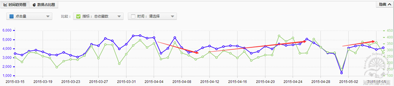 流量和收藏方面,方案執(zhí)行前,同樣,在3月底是呈現(xiàn)下降的趨勢,方案執(zhí)行后,流量和收藏都有一定程度的提升,五一店鋪放假,推廣力度降低,流量和收藏有所下降。