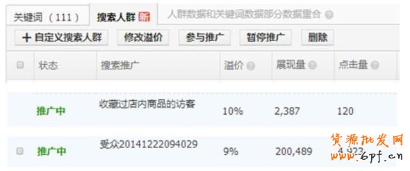 于是,我開啟定向推廣,針對面臨的流量少問題,也開啟了“搜索人群”。搜索人群對于中小賣家可以說是一大福音,因為其流量相對精準,更容易把錢花到刀刃上,更容易控制花費。