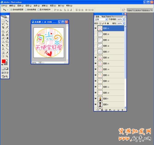 6、復(fù)制一個(gè)背景圖層移至最上一層,將圖層名稱修改為圖層10,然后使用漂亮的彩色手寫文字,添加一些小裝飾。這里的制作步驟是根據(jù)動(dòng)畫的變化來制作的,也就是每層顯示的內(nèi)容就是后面動(dòng)畫每幀的內(nèi)容,如圖所示的順序最后變換內(nèi)容制作個(gè)性的店名