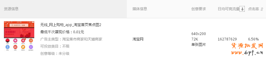1、無線投放展位選擇:目前鉆石展位后臺(tái)總共提供了88個(gè)無線端展位供大家選擇,根據(jù)日均展現(xiàn)量排序,選取了日均展現(xiàn)量最大的無線app淘寶首頁焦點(diǎn)進(jìn)行測(cè)試。如下圖: