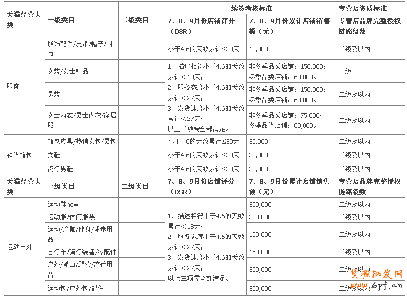 天貓2016年度各類目續(xù)簽標準出爐,女裝男裝三個月銷售額需要達到15萬元,箱包、珠寶配飾、3C數碼、家用電器三個月銷售額要達到3萬元,母嬰、食品等類目三個月累積銷售額需要達到12500元。從實際情況分析標準不高,但是還沒達到標準的賣家下半年要努力啦。