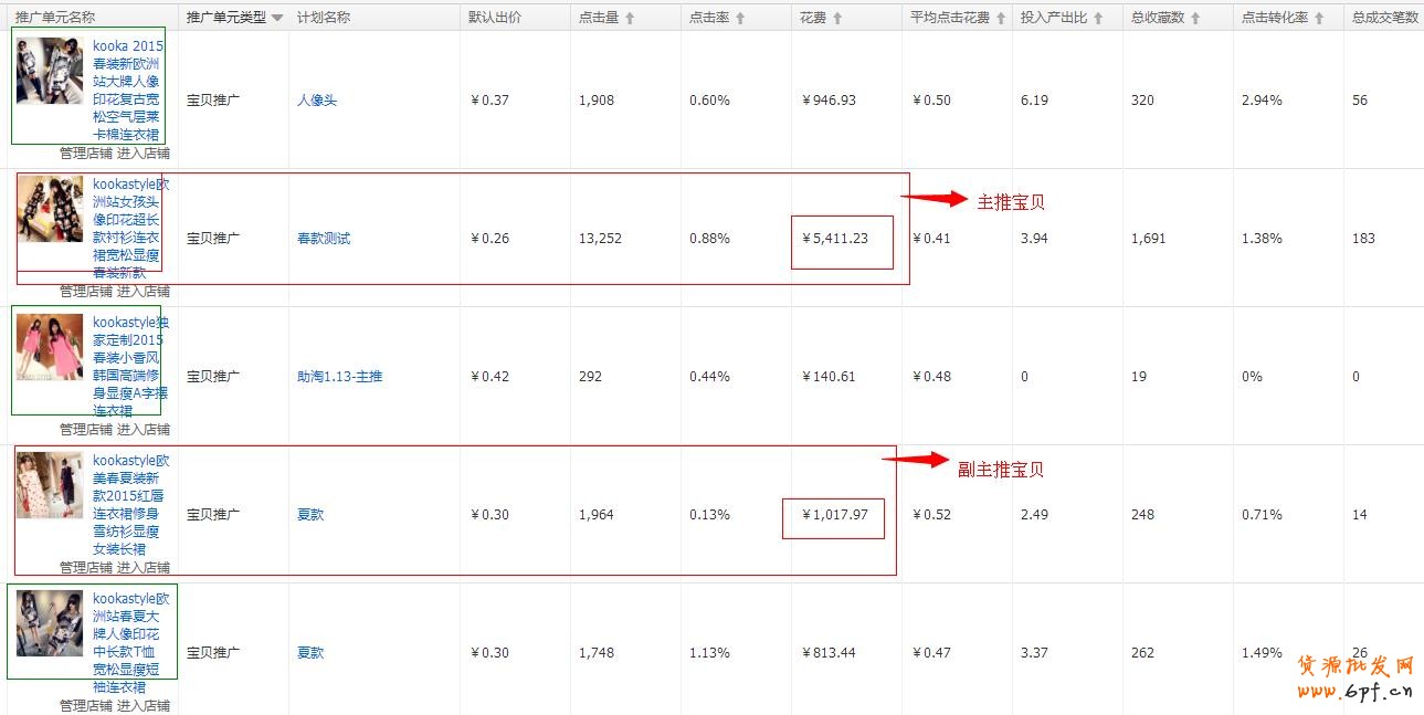 紅框中一款為主推,花費(fèi)最大,另外一款紅框中的為副主推寶貝,而綠框中的則是作為副推寶貝進(jìn)行推廣的。