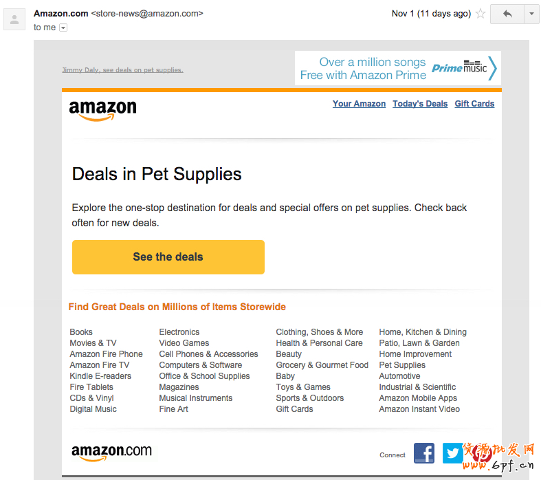 如果你在亞馬遜的網(wǎng)站或其他可跟蹤途徑上查找搜索了寵物狗的服裝和咀嚼玩具,你的瀏覽活動(dòng)將會(huì)使你收到下面這樣的一封觸發(fā)電子郵件。這封郵件設(shè)計(jì)非常簡(jiǎn)潔,把你的注意力集中在按鈕“see the deals”上,吸引用戶(hù)再次互動(dòng)購(gòu)物。
