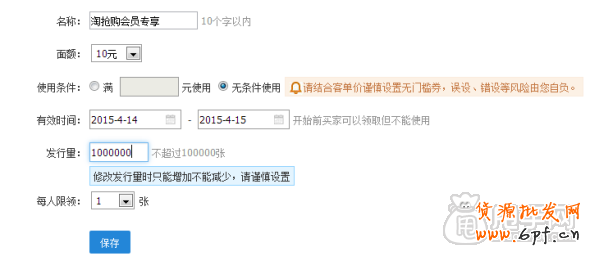 活動開始前一天,可以在店鋪“會員關系管理”里面的“客戶管理”給老客戶發(fā)送店鋪優(yōu)惠券,優(yōu)惠券的名稱可以寫“淘搶購代金券”、“搶購老客戶專享”之類的,讓老客戶收到就大致明白是活動專用的,建議代金券的使用時間可以限定在搶購活動時長之內。如0點場的,可以設置0點到24點;建議在允許的情況下,可以發(fā)放面值大點的無門檻代金券。如下圖