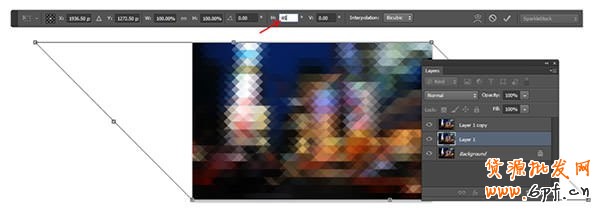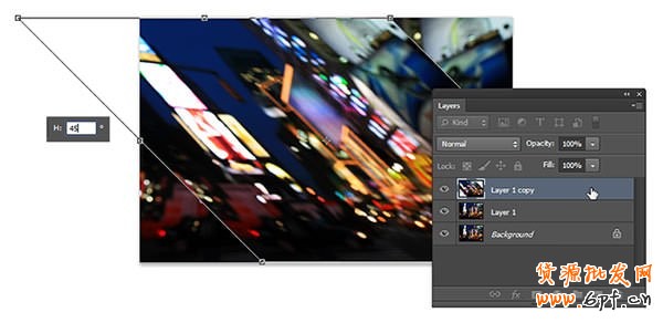 使用Ctrl + T自由變換工具讓圖像水平傾斜45度;