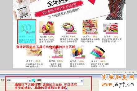 1.首先在網(wǎng)上下載好你的資源,也就是你所要使用的寶貝圖片。接下來使用Macrimedia Fireworks 8打開剛才下載好的圖片進(jìn)行編輯,點(diǎn)擊選擇矩形熱點(diǎn)工具。拉出你先要添加鏈接的區(qū)域,在屬性欄鏈接出可以填寫上寶貝的鏈接地址。