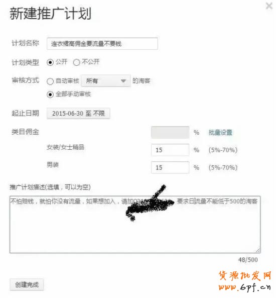 先自建高傭金計(jì)劃,然后要全部手動(dòng)審核,這個(gè)傭金可以設(shè)的賠一些錢,因?yàn)榭偙戎蓖ㄜ嚭纤?。比如進(jìn)價(jià)是40元的女裝,賣80元,你可以返60%的傭金出去。大家應(yīng)該很容易理解了。