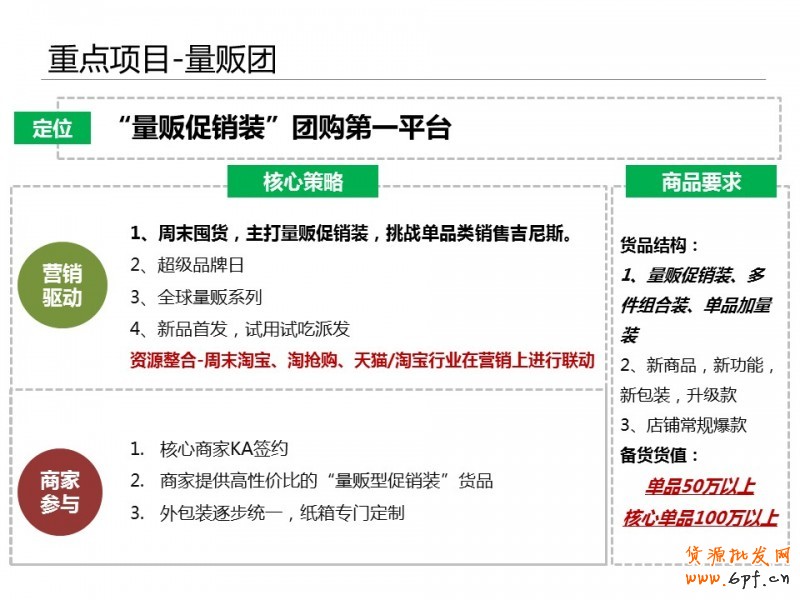聚劃算將整合全網(wǎng)資源引爆,幫助品牌商家打造創(chuàng)紀(jì)錄活動(dòng)。商家合作主要三種模式 基礎(chǔ)日常合作決定營(yíng)銷活動(dòng)合作機(jī)會(huì) 營(yíng)銷活動(dòng)表現(xiàn)決定大促合作機(jī)會(huì)。所以,首先做好日?;顒?dòng)非常重要。事件營(yíng)銷是今年特色營(yíng)銷重要內(nèi)容,圍繞特色主題展開各種匯聚系列活動(dòng)。