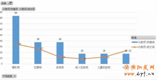 B品牌主要關(guān)鍵詞布局在蝶形枕,84個熱搜詞、35個成交詞。