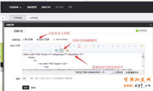 5.把代碼復(fù)制好之后進(jìn)入賣家中心-網(wǎng)店裝修-店招設(shè)置-編輯-自定義店招-選擇代碼的編輯模式。接著粘貼你復(fù)制的代碼過來就行了。如果你把店招和導(dǎo)航設(shè)計(jì)在一起的,那就是150px,你在下框內(nèi)的高度輸入150就可以了,最后點(diǎn)擊“保存”。