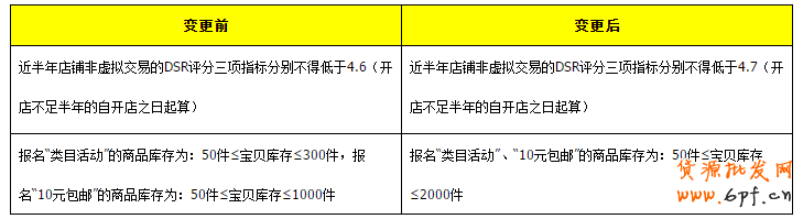 主要變更點(diǎn):對(duì)報(bào)名要求中的店鋪DSR和商品庫(kù)存進(jìn)行調(diào)整。