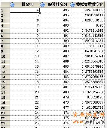 這個就是我剛剛弄好的兩個變量,其中假設(shè)排名分,就是設(shè)的一個根據(jù)排名越高,給分越高的一個設(shè)定,在這個分析中,并沒有什么作用,大家不必去在意。然后,需要做一個初步判斷,最簡單的方法,就是作圖,直觀,簡單,能看出很多東西。我先做了一個散點圖,看看分布。