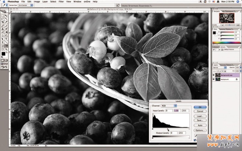 3、點擊“圖層”--“調(diào)整”--“通道混合器”,我們在上一步驟中看到藍莓的質(zhì)感在紅色通道中表現(xiàn)情況比較理想。所以,我們需要盡可能保留多一些紅色通道的值。另外,綠色區(qū)將葉子和藍莓區(qū)分出來,所以,綠色通道也要運用起來。而藍色通道,我們看到噪點很多畫面也是比較暗,所以,這里我們現(xiàn)不動它。跟著我們回到“圖像”——“調(diào)整”——“通道混合器”,給紅色55%,綠色45%。