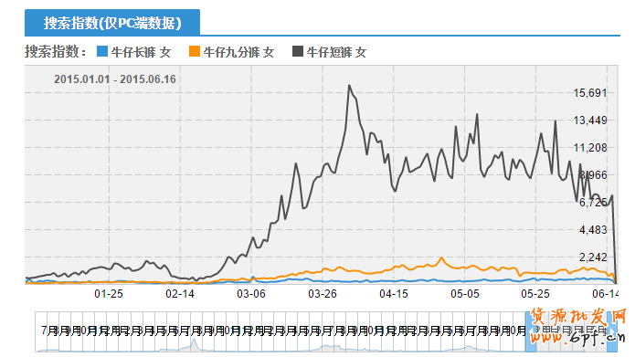 在寶貝選擇上,該寶貝的基礎(chǔ)銷量和評價優(yōu)勢并不是店鋪內(nèi)最好的,在店鋪內(nèi)排名第三,前兩款寶貝是牛仔長褲和牛仔九分褲。但卻是當(dāng)前最應(yīng)季,通過對淘寶指數(shù)的數(shù)據(jù)分析,牛仔短褲當(dāng)前的搜索需求量最高的,遠遠超過長褲和九分褲的,因此在選擇上最終選擇了牛仔短褲報名淘搶購活動。