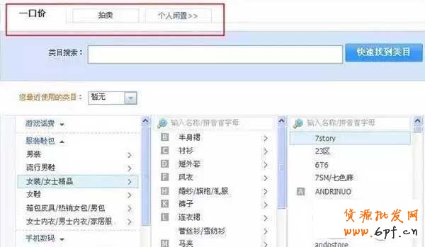 二、進去發(fā)布寶貝時,可以進行類目搜索或選擇類目時,有游戲花費、服裝鞋包、手機數(shù)碼等提供給賣家,而且默認是一口價。
