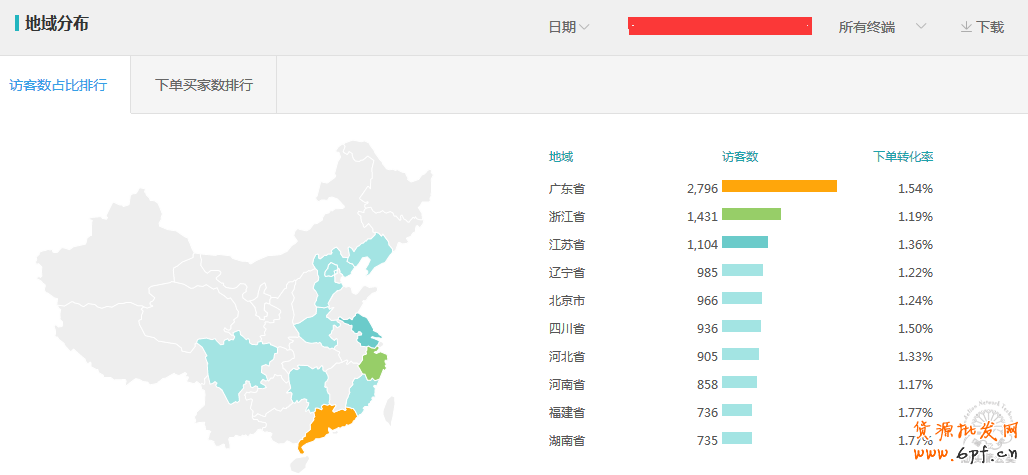 通過生意參謀的訪客分析,對店鋪近30天的訪客進(jìn)行分析、統(tǒng)計(jì),獲取店鋪訪問量高的省份以及對應(yīng)的轉(zhuǎn)化率。